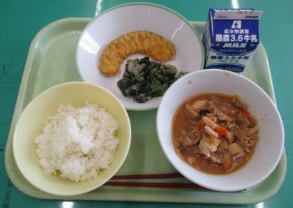 今日のメニューは、ごはん、豆腐のみそ炒め、かぼちゃの天ぷら、よごし、牛乳 でした。