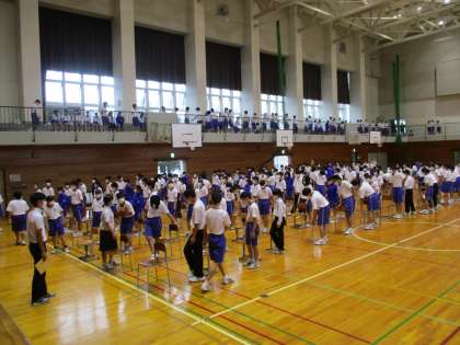 また、先日の体育大会結団式と同じく密にならないように、1年生はランニング走路で参加し、2,3年生は体育館フロアに、十分な間隔をとって整列しました。