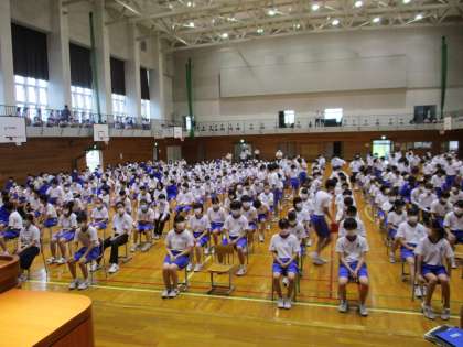 本日の終業式は、暑さとコロナ対策のため、8:30から体育館に入場しました。