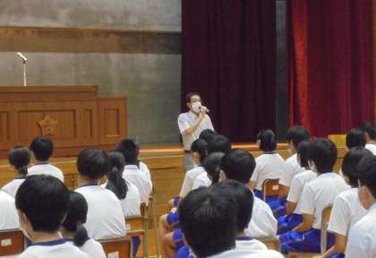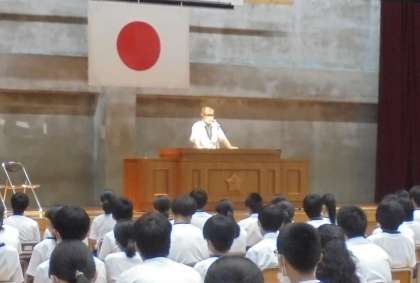 その後、生徒指導主事から夏休みにの過ごし方について、正しく判断して、正しく行動することが大事だとして、新型コロナウイルス感染防止、熱中症防止、交通事故防止、水の事故防止について話をしました。