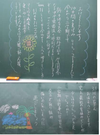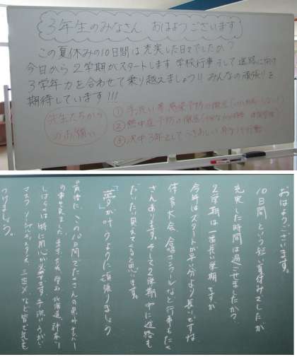 3年生の廊下のホワイトボード、教室の黒板にも生徒へのメッセージが書かれていました。