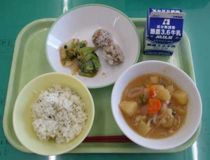 メニューは、菜めし、鶏肉とじゃがいもの煮物、珍珠丸子、チンゲンサイのおひたし、牛乳 でした。