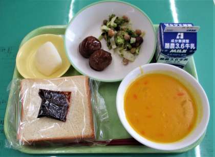 今日のメニューは、食パン、チョコレートクリーム、肉だんご、ビーンズサラダ、かぼちゃポタージュ、梨、牛乳 でした。