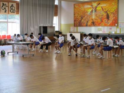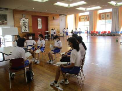 画像中、下:33H音楽 合唱練習 ランチルームでソーシャルディスタンスを保って練習をしています