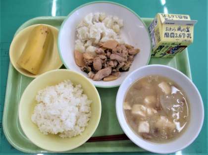 今日のメニューは、ごはん、あっさりチキン、粉ふきいも、なめこ汁、バナナ、牛乳 でした。
