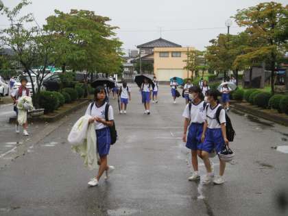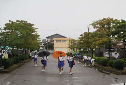今朝の登校時間は、雨が降ったりやんだりでした。