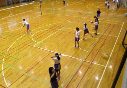 画像上:サーブ練習をしている女子バレーボール部