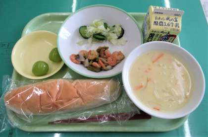 今日のメニューは、米粉コッペパン、えびときのこのガーリックソテー、そえ野菜、野菜ポタージュ、シャインマスカット、牛乳 でした。