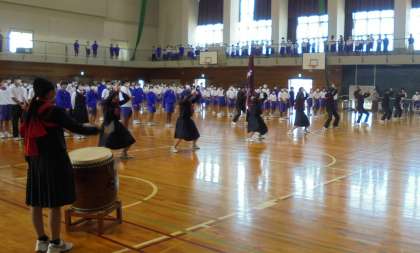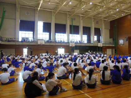壮行会 9月16日(水) 公開日 2020/09/16 更新日 2020/09/16 部活動について 入場した選手に向けて、生徒会長が激励の言葉を述べ、続いて各部の代表が意気込みや目標を大きな声で発表しました。 次に、沢中応援団のリードのもと、選手にエールをおくりました。 今日の壮行会でも新型コロナウイルス感染防止対策として、1年生は体育館ギャラリーで参加するとともに、できるだけ窓や扉を開け、換気をしました。
