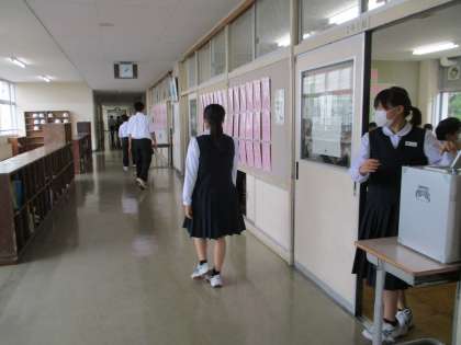 立会演説会に続いて、選挙管理委員から投票についての諸注意があり、その後、各学級の入り口に設置した投票箱に、各自が投票しました。選挙管理委員がしっかりと投票の様子を確認していました。