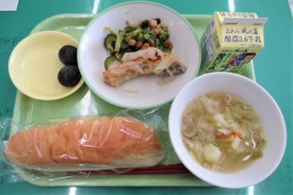 今日のメニューは、コッペパン、鮭マリネ、ビーンズサラダ、野菜のスープ煮、巨峰、牛乳 でした。