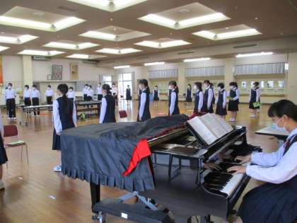 音楽では、ランチールームで合唱コンクールの曲を練習していました。練習を重ねるうちに、とてもよい合唱になっていきました。