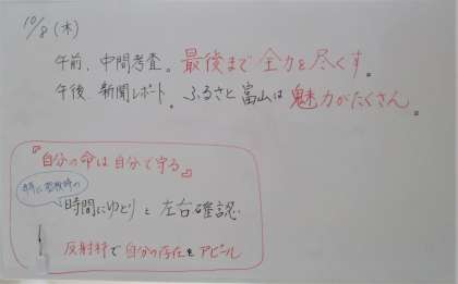 画像上と中は、1年生のホワイトボードです。学年企画(生徒)からのお知らせもあります。