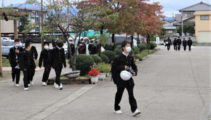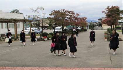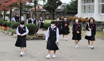 今日から部活動が再開されるので、部活動の用意で荷物が多くなっている生徒や、3年生では卒業アルバム用の部活動写真を撮影するので、用具を持ってきている生徒が見られました。