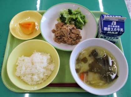 今日のメニューは、ごはん、豚肉のジャンロー、そえ野菜、じゃがいものみそ汁、柿、牛乳 でした。今日も秋の味覚の柿が出ました。。甘くてとても美味しかったです。