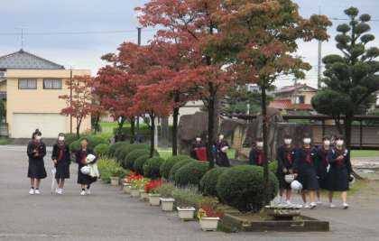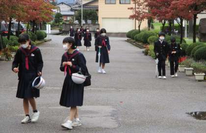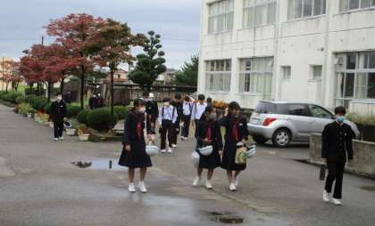 明け方に降っていた雨が上がり、多少の水たまりがある中、生徒は元気に登校してきました。