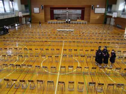 今年は、新型コロナウイルス対策として、体育館いっぱいに間隔を取って生徒の座席を配置しました。各学年、各クラス1列になっています。前後の間隔が1.5m程あります。