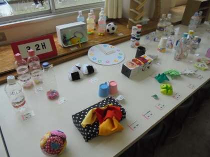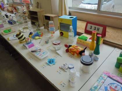 被服室の、3年生の家庭科作品「幼児のための手作りおもちゃ」です。