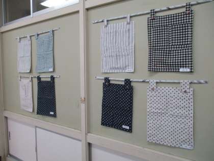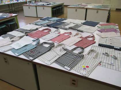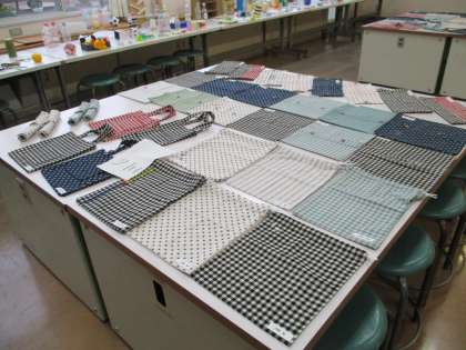 被服室の2年家庭科「基礎縫い布の小物製作」です。