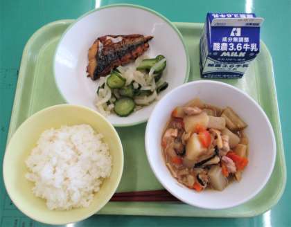 今日のメニューは、ごはん、さばの塩焼き、酢の物、筑前だき、牛乳 でした。脂ののった「さば」でした。