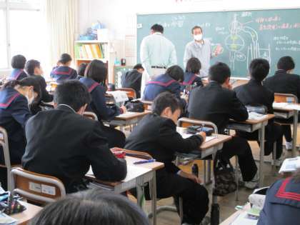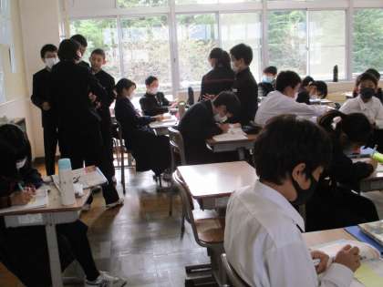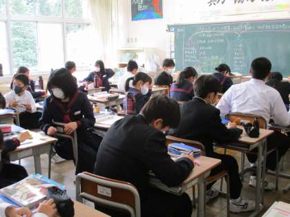画像中、下:12H保健体育 ストレスが心の健康に与える影響を知り、その対処法を考えよう。 生徒は先生から付箋をもらい、いろいろな考えを書いていました。