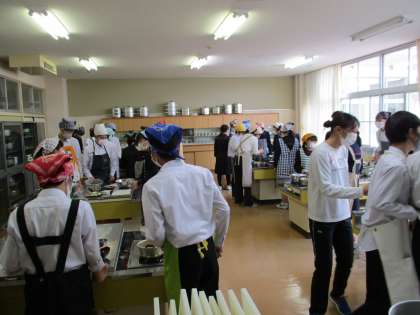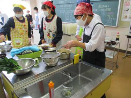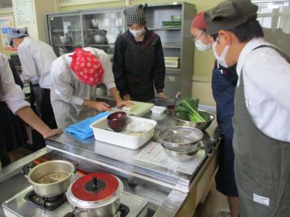画像は、22Hの調理実習「青菜のごま和えとすまし汁を作ろう」です。昆布やかつお節で出だしを取っていたので、すごくいい香りが漂っていました。