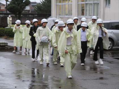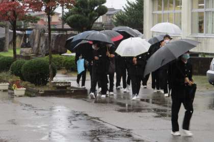 自転車登校の雨ガッパの集団や、傘を差した集団が見られました。