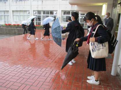 今朝の登校時間には、時折強く、冷たい雨が降りました。