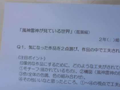 クラスメイトの描いた「風神雷神が見ている世界」を鑑賞し、互いに感想を書いています。