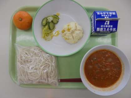 今日の献立は、ソフト麺のミートソースかけ、蒸しパン、フレンチサラダ、みかん、牛乳です。