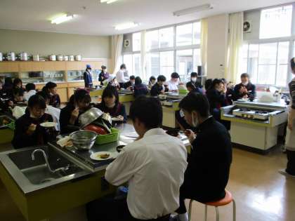画像上:23H家庭 実習でつくったしょうが焼きと中華スープを美味しそうに食べていました。