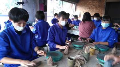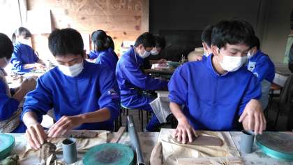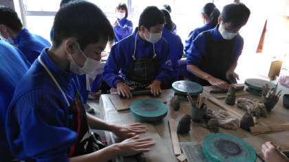 こねたり伸ばしたりして、カップやお皿を作っています。