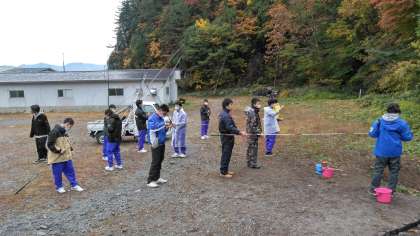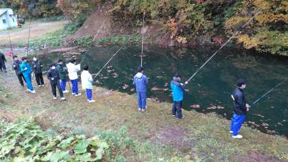 38名の生徒がフィッシングを体験しました。白馬47スキー場の片隅に作られたため池のような場所で、最初に竿の使い方やえさのつけ方を聞いて、すぐに釣り始めました。えさは、人工のいくらを使いました。