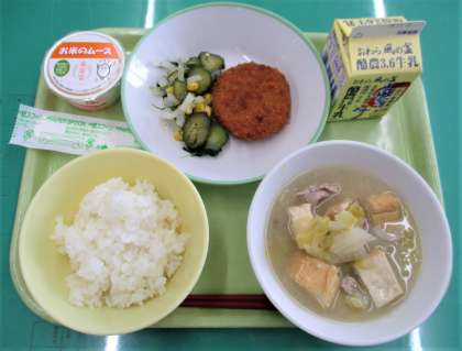 今日は「学校給食とやまの日」で、富山産の食べ物をたくさん使ったメニューで、ごはん、えごまドレッシングサラダ、さつま汁、小松菜メンチカツ、富富富のお米ムース、牛乳 でした。