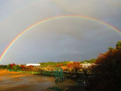 今日はスペシャルデーで、その後、区友会があったので、下校が16:00頃になりました。その時、ちょうど東の空にきれいな虹が架かっていました。「NiziU」(二重)の虹でした。