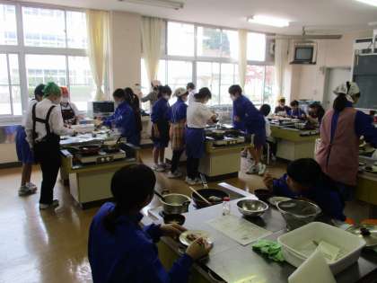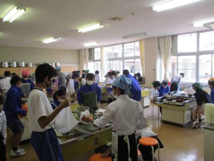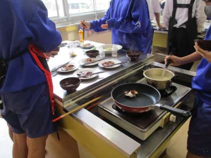 画像は13Hの調理実習で、豚のしょうが焼きと中華スープを作っています。早くできた班から食べています。