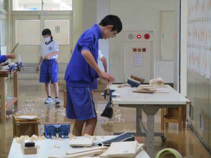 画像中、下:12H技術 木材加工 かんな、のこぎり、サンディングマシーンなどを使って作品作りに励んでいます。