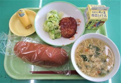 今日のメニューは、黒糖コッペパン、ハンバーグのケチャップ煮、ゆでキャベツ、かきたまスープ、バナナ、牛乳 でした。