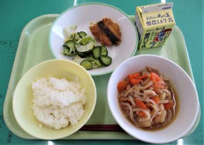 今日のメニューは、ごはん、揚げサバのみぞれだれ、はくさいのゆず和え、肉じゃが、牛乳 でした。