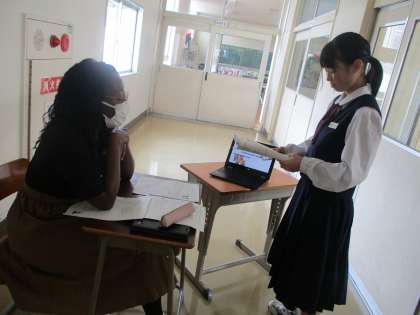 スピーチの直前まで友達同士で練習をしたり、発表の内容を振り返ったりと一生懸命に頑張っていました。ンダンゴ先生は、生徒たちが作成したスライドのクオリティの高さに感激していました。また、アイコンタクトやジェスチャーを取り入れながら工夫して発表している様子を高く評価してくださいました。次回も頑張りましょう。