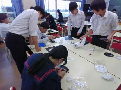 皿にそれぞれがデザインした模様を描いています。