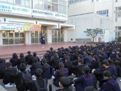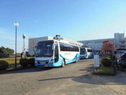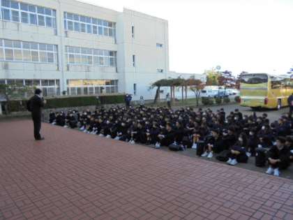 雲一つない爽やかな快晴の朝、2年生の校外学習がスタートしました。いつもより早く登校した生徒ですが、みんな笑顔で「行ってきます!」と元気に挨拶してバスに乗って金沢に向けて出発しました。