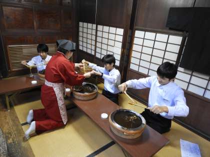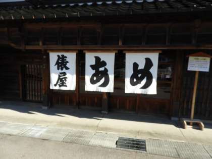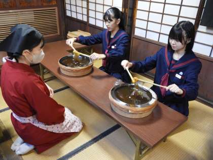 あめの俵屋にて、あめ詰め体験中。瓶にうまく入れられました。