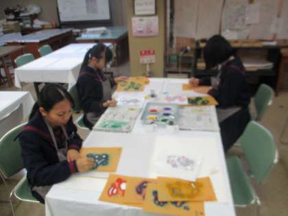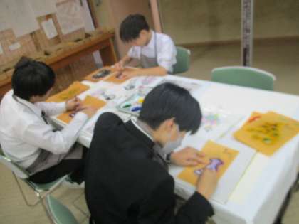 加賀友禅会館にて、友禅染めを体験しました。伝統的な絵柄(型)をもちいて、ハンカチを染めました。