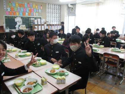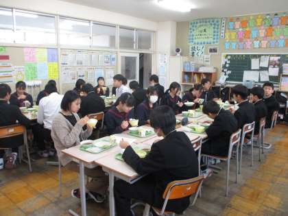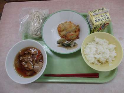おいしい給食に舌鼓を打ちながら、会話を楽しんでいます。今日の献立はかき揚げにおうどんです。午後からの家庭学習や明日のテストに向けて、エネルギーをしっかりとりましょう。