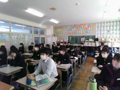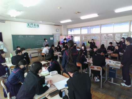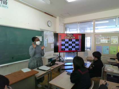 英語の授業では、ALTのンダンゴ先生が準備したクイズでこれまでの学習のおさらいをしました。ンダンゴ先生の話す英語を一生懸命に聞いていました。