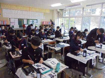国語の授業では、書き初め大会に向けて練習をスタートしました。一年生の課題は「日進月歩」です。手本をよく見ながら、バランスよく書けるように練習しています。