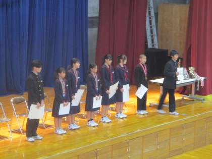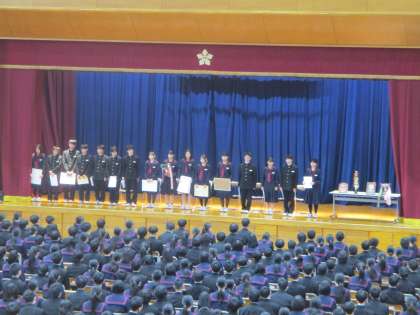 6限目は全校生徒が体育館に集まって受賞報告会が行われました。今学期、部活動の大会で入賞したり優秀作品で受賞したりした生徒が、壇上に上がって一人一人紹介されました。