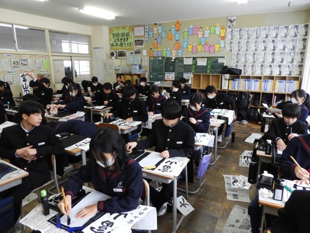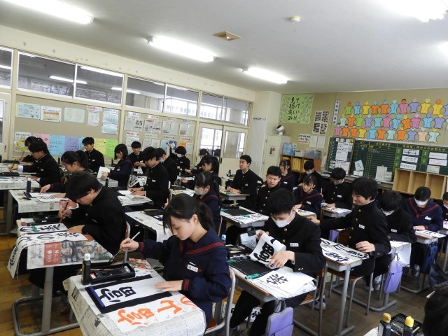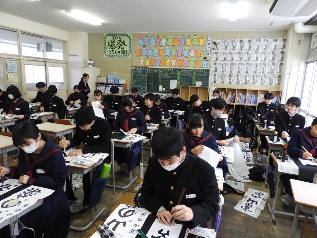 始業式が終わり、各クラスで書初大会が行われました。真剣に静かに集中して『富山の薬』を書く姿が見られました。