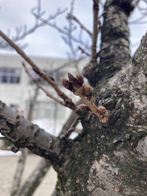 生徒玄関前のサクラの花芽の様子です。サクラは4月にきれな花を私たちに見せてくれますが、実は秋に花芽をつくり、休眠します。そして、冬の厳しい寒さで目覚め、開花にむけてつぼみを膨らませています。冬の寒い時期に準備をしているのです。